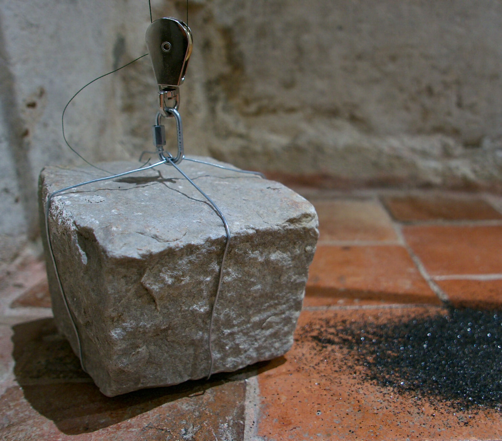 à découpe et PAR56, pico projecteur, servomoteurs, sable noir, sable blanc, cinq haut-parleurs, objets provenant de fouilles archéologiques.
